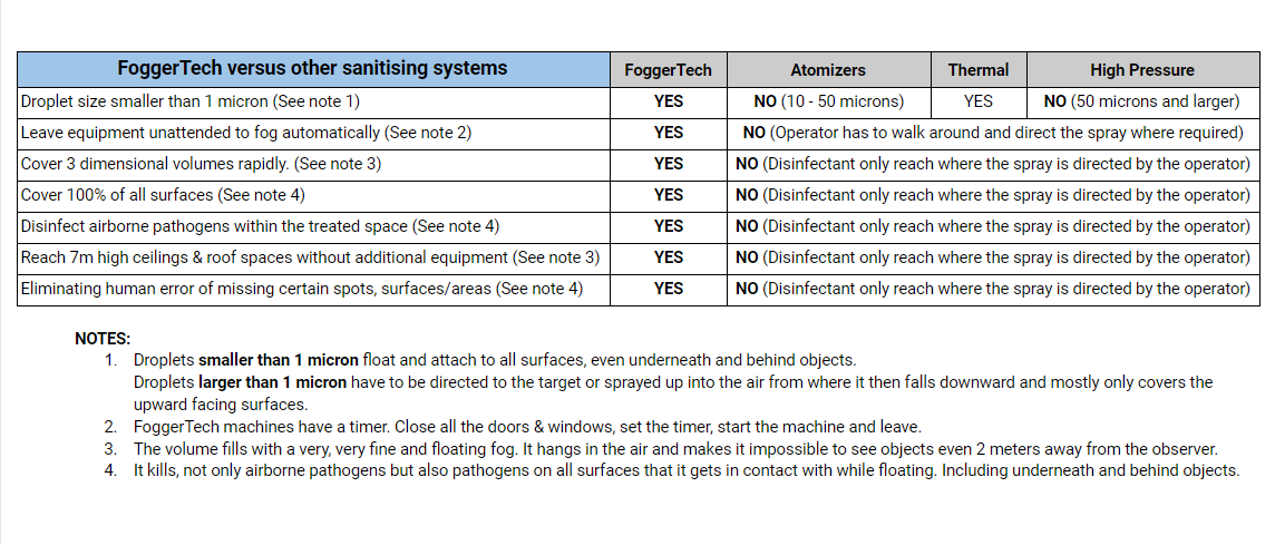 FoggerTech’s “Nano-Vapour” machines with “Nano-Shield” disinfectant is the perfect combination, providing healthy sanitation, not only on hard-to-reach surfaces, but also in the air.